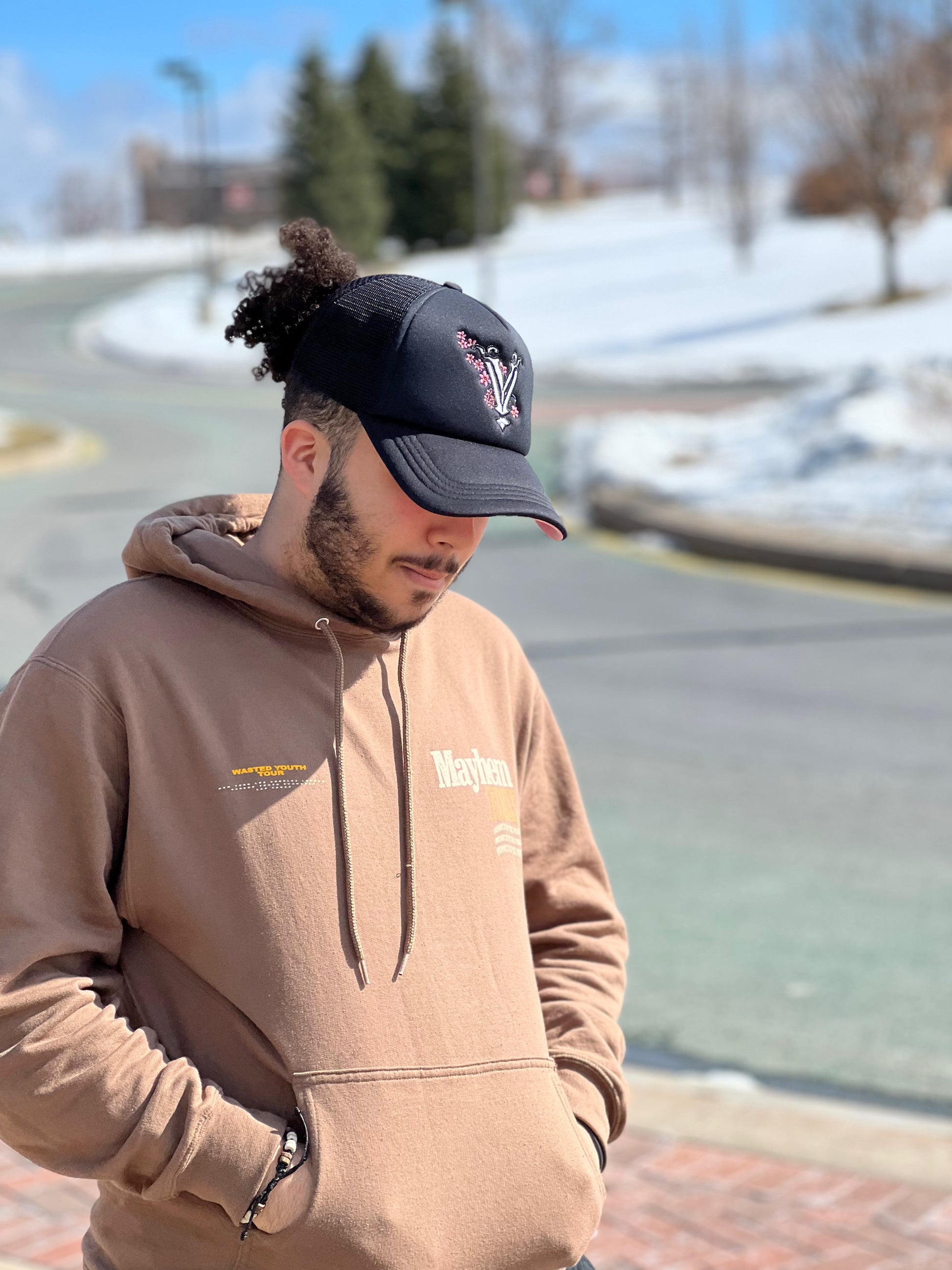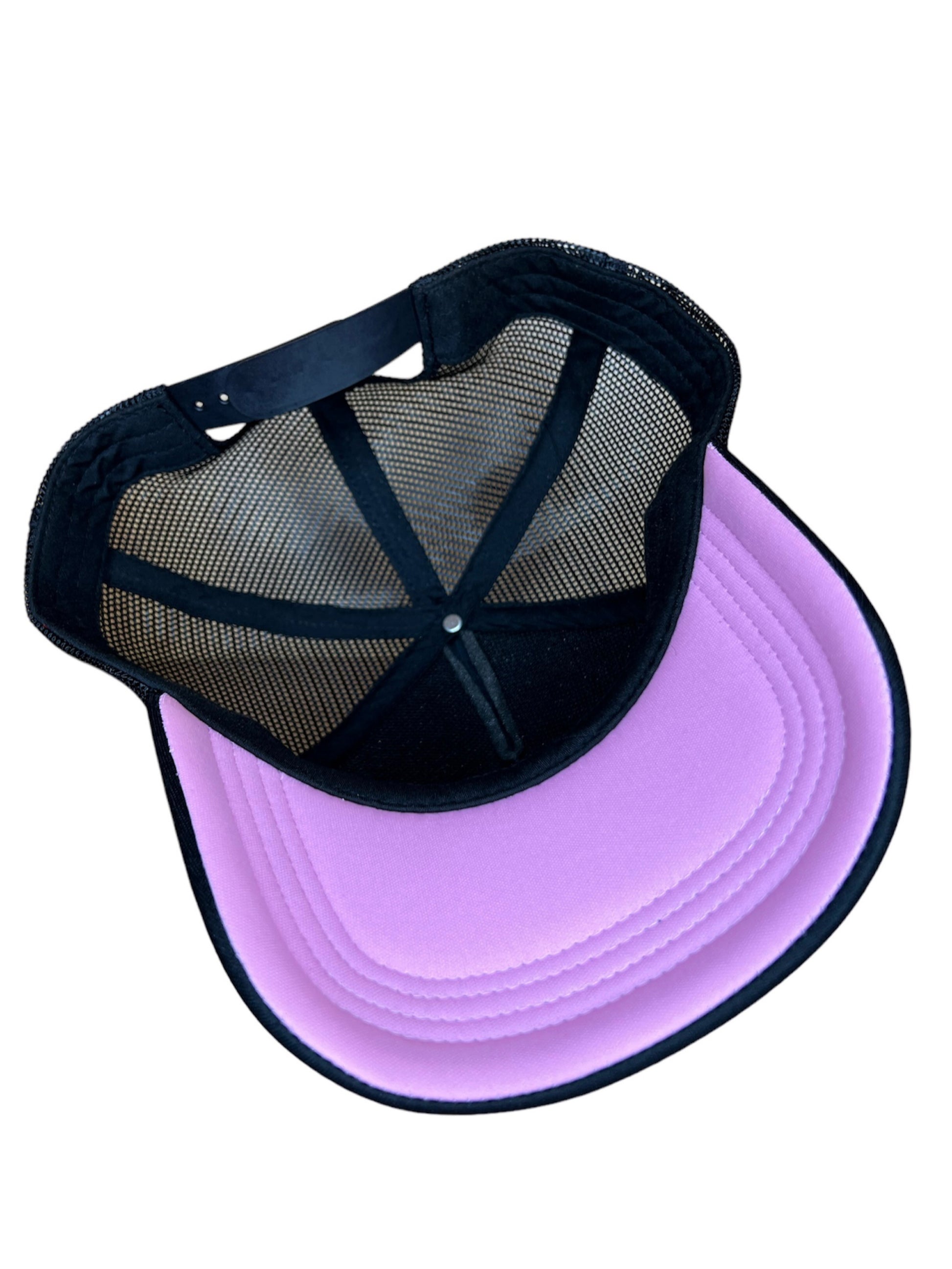 Part of our cherry blossom collection is this Black Trucker hat with our classic logo. Embroidered trucker hat outfitted with breathable mesh panels and an adjustable snapback strap.