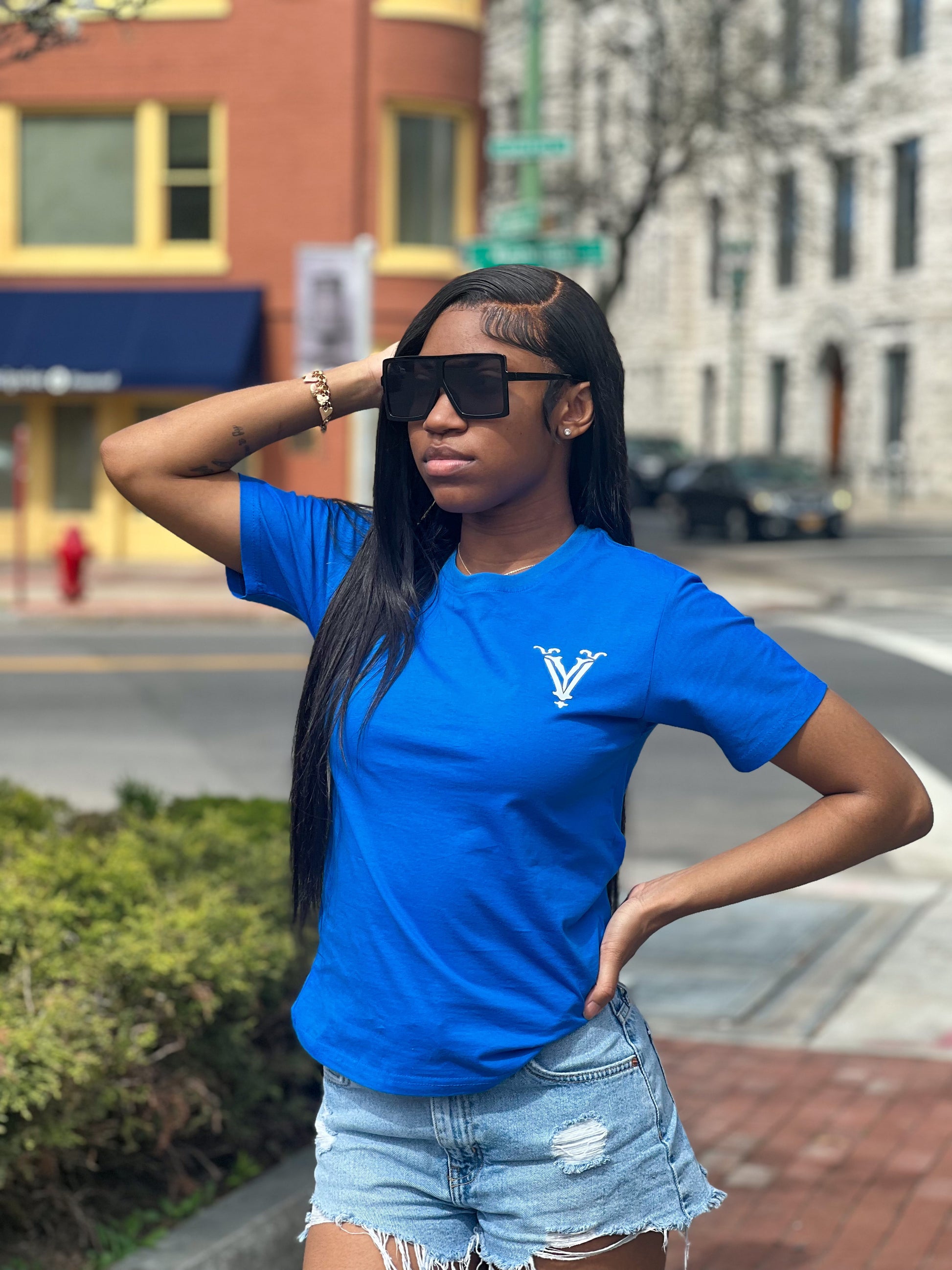 Blue short sleeves T-shirt with Vysma logo in white at front and white cartoon "Vysma" spelled out on the back. Designed to be a lightweight summer tee for comfort.